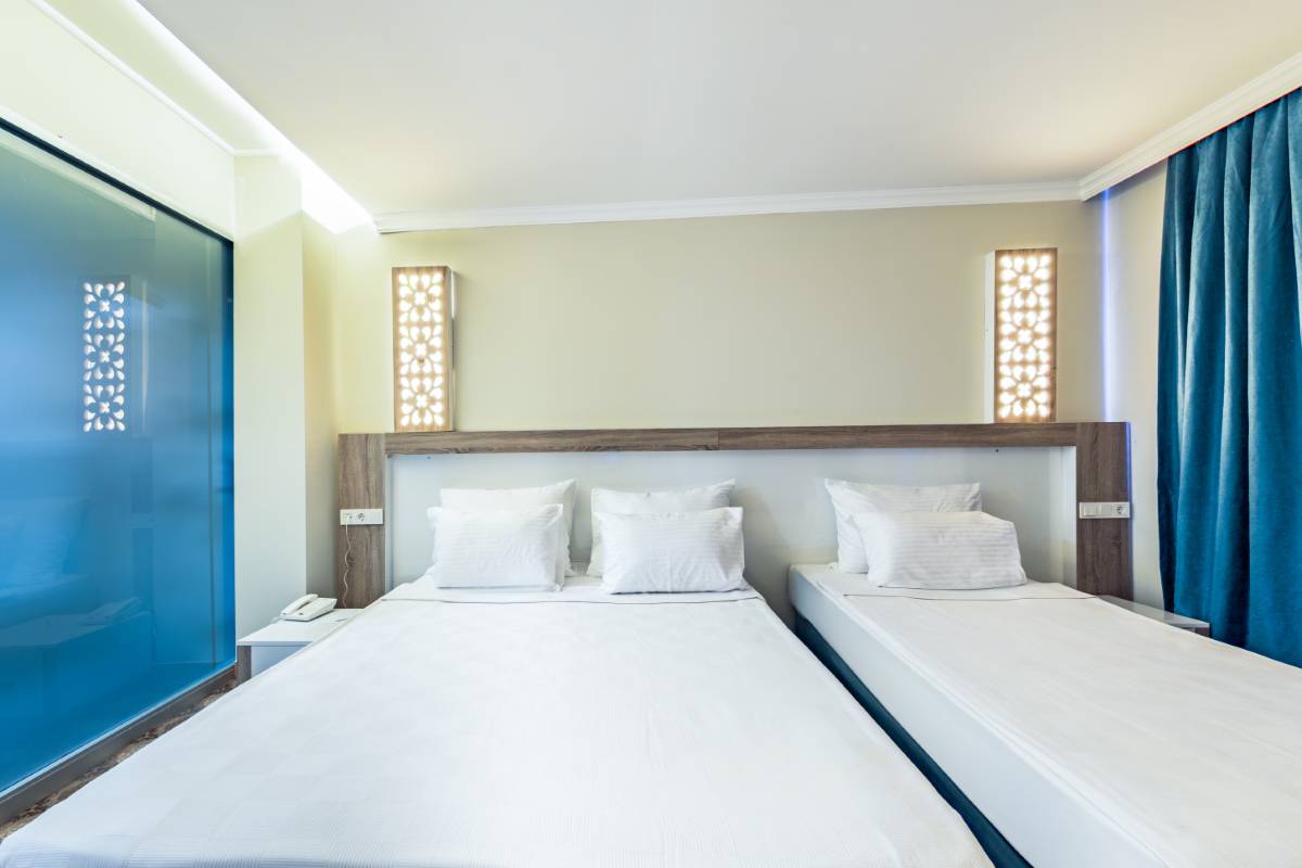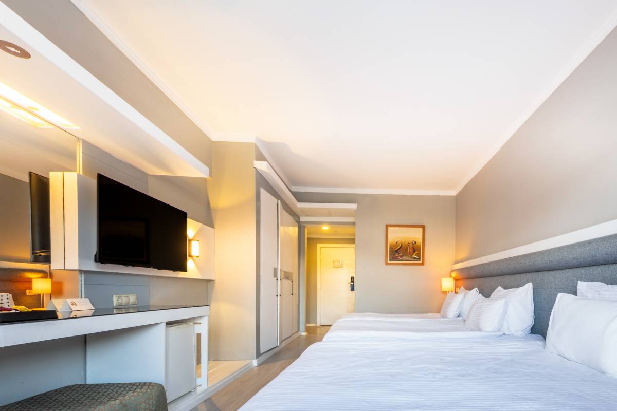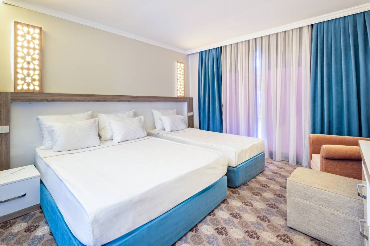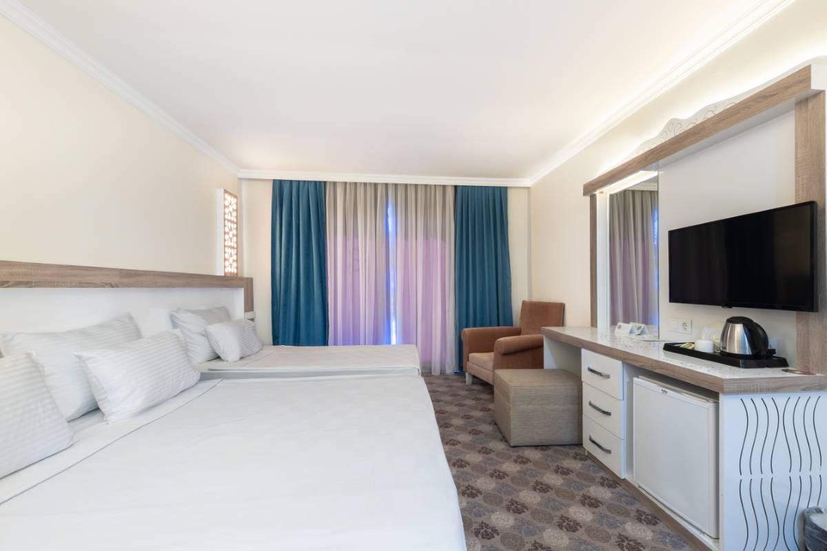 Dedeman Kemer Resort'un Havuz Manzaralı Superior Odası, geniş alanı ve modern olanaklarıyla rahat bir konaklama deneyimi sunar. Odanızdan muazzam havuz manzarasını izleyerek, tatilinizi dinlendirici bir şekilde geçirebilirsiniz.